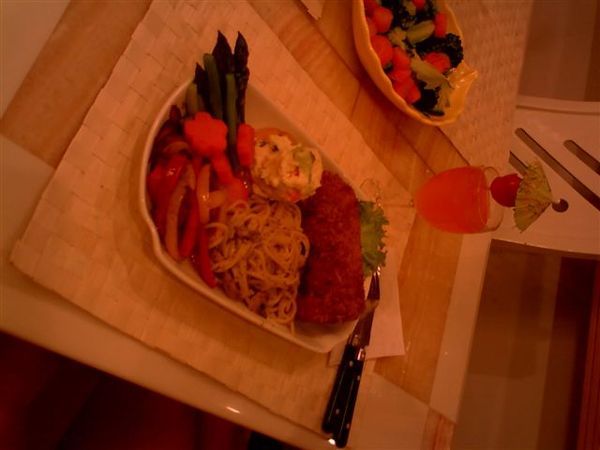 昨天是白色情人節,所以特別準備了這道日式豪華炸豬排套餐給平日辛勤工作的老爺一個驚喜。套餐的擺盤很簡單,首先將蘆筍跟蘿蔔川燙擺盤備用,在將紅黃甜椒用橄欖油拌炒用胡椒跟鹽調味後擺盤備用,在挖出一匙馬鈴薯泥(用沙拉醬與蔬菜拌勻),最後在將是先煮好的白醬義大利麵放在盤中即完成了套餐的擺盤。接下來就是套餐的重點,日式炸豬排。